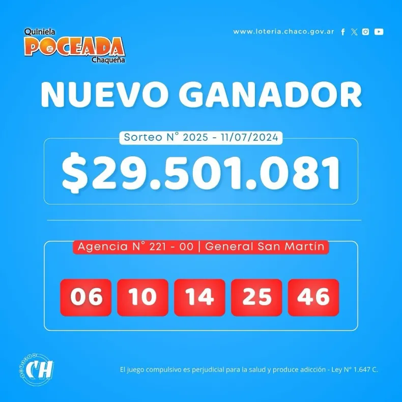 Se trató del sorteo número 2025 de la Poceada Chaqueña y en esta ocasión el ganador recibió un total de $ 29.501.081.