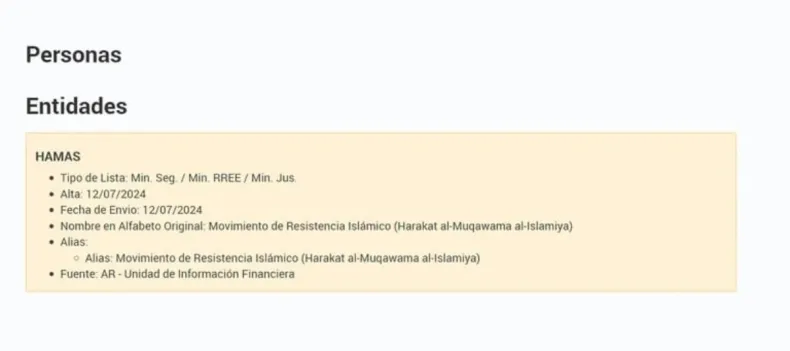 En la base de datos del RePET, que es abierta, figura que el ministerio de Seguridad le pidió al de Relaciones Exteriores y al de Justicia que dé de alta a Hamás: "Nombre en Alfabeto Original: Movimiento de Resistencia Islámico (Harakat al-Muqawama al-Islamiya) Alias: Movimiento de Resistencia Islámico (Harakat al-Muqawama al-Islamiya). Fuente: AR - Unidad de Información Financiera", figura en el registro, con fecha de este viernes.