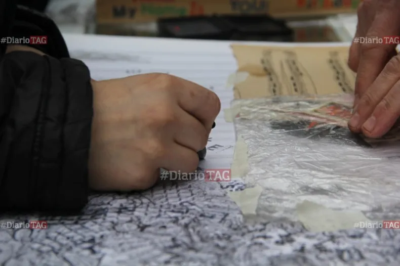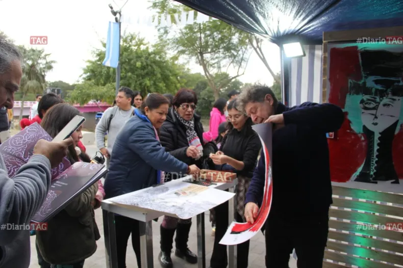En cuanto a la obra colaborativa que realiza en el stand de Diario TAG, expresó que su idea es "compartir" algunas de sus técnicas. "En este caso, estamos haciendo el frottage, que es una técnica surrealista y que consiste en frotar sobre alguna superficie, en este caso una vereda, y levantar una textura", explicó.