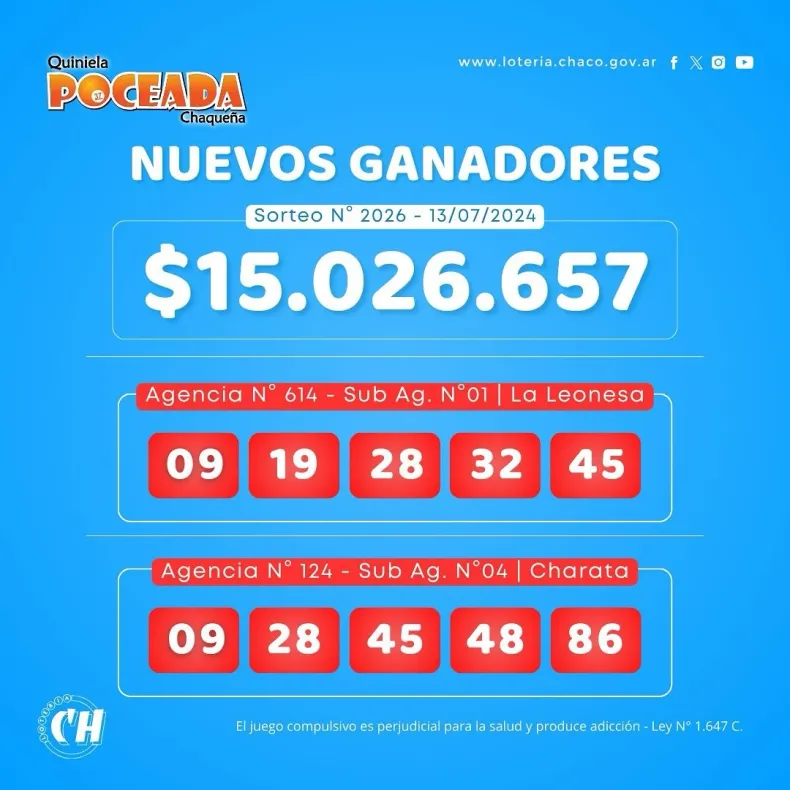 Se trató del sorteo número 2026 de la Poceada Chaqueña del día sábado 13 de julio y en esta ocasión los ganadores recibieron más de 7 millones de pesos cada uno.