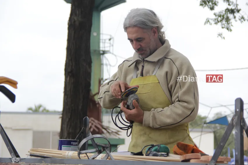 El artesano está creando un juguete gigante en el predio de la Bienal, lugar al que calificó como "un taller a cielo abierto" y reconoció que deja a la gente la enseñanza de que atrás de cada obra "hay una persona que la hizo".