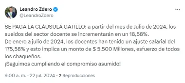 El gobernador de la provincia Leandro Zdero anunció en redes sociales que se pagará la cláusula gatillo a partir de julio 2024, lo que incrementará el sueldo docente en un 18,58%.