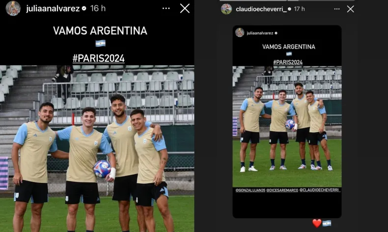 El jugador del Manchester City publicó en sus historias de Instagram una fotografía junto Claudio Echeverri, Gonzalo Luján y Marco Di Cesare con la leyenda "Vamos Argentina", #París2024, la que el "Diablito" resposteó con un emoji de la bandera argentina y un corazón rojo.