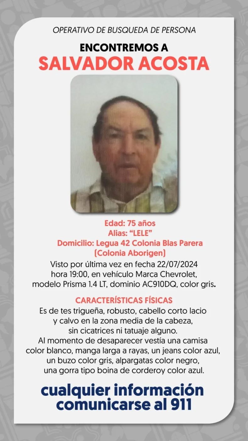 Cualquier novedad sobre la persona, favor de acercarse a la unidad más próxima a su domicilio o bien comunicarse a Comisaria Colonia Aborigen al 3624646039 o al servicio de emergencias 911.