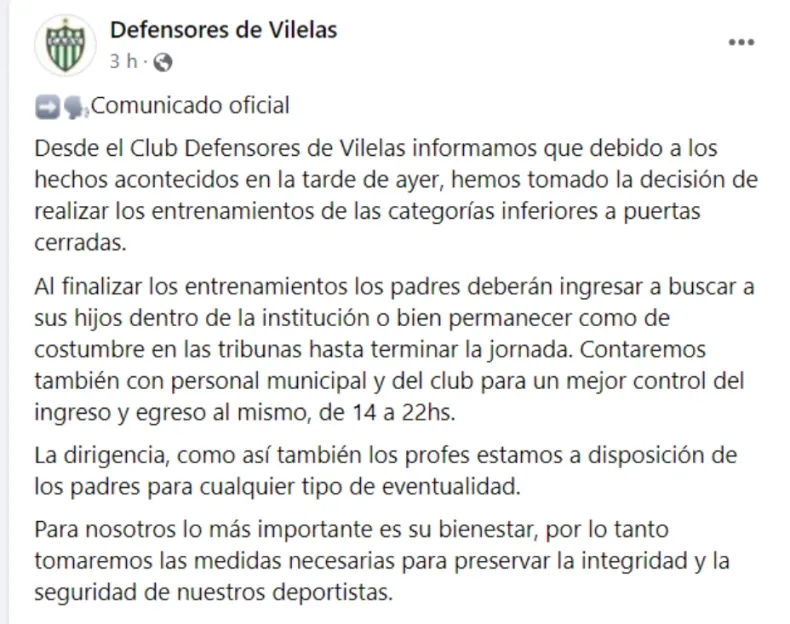 "Informamos que debido a los hechos acontecidos en la tarde de ayer, hemos tomado la decisión de realizar los entrenamientos de las categorías inferiores a puertas cerradas", expresaron y agregaron que los padres "deberán ingresar a buscar a sus hijos dentro de la institución o bien permanecer como de costumbre en las tribunas hasta terminar la jornada".