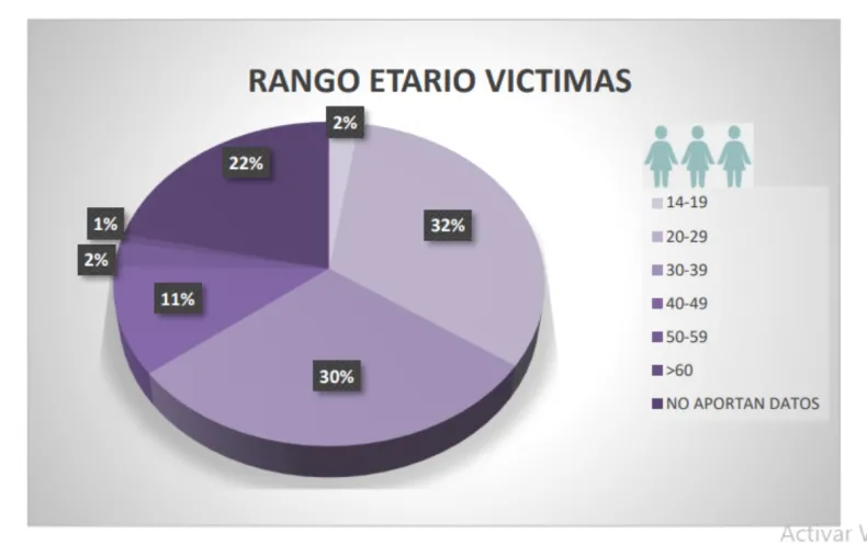 En cuanto a la distribución por rango etario de víctimas, el análisis revela que la mayoría de los victimarios se encuentra en el rango etario de 20 a 29 años, representando el 21% de los casos registrados.