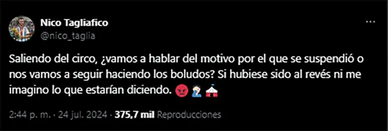 Otros jugadores de la Scaloneta también se refirieron a la particular situación. Uno fue Nicolás Tagliafico, quien se mostró crítico con las autoridades del encuentro: "Saliendo del circo, ¿vamos a hablar del motivo por el que se suspendió o nos vamos a seguir haciendo los boludos? Si hubiese sido al revés ni me imagino lo que estarían diciendo", reprochó en su cuenta de X.