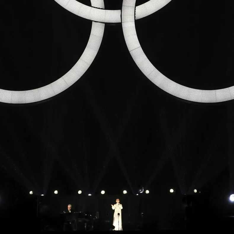 Desde la Torre Eiffel, con un vestido blanco de mangas largas, cuello alto y bordado en lentejuelas, la artista cautivó al público al cantar en francés. Esta es la primera presentación en vivo que hace Céline luego de comunicar que se retiraba de los escenarios porque padecía el síndrome de la persona rígida.
