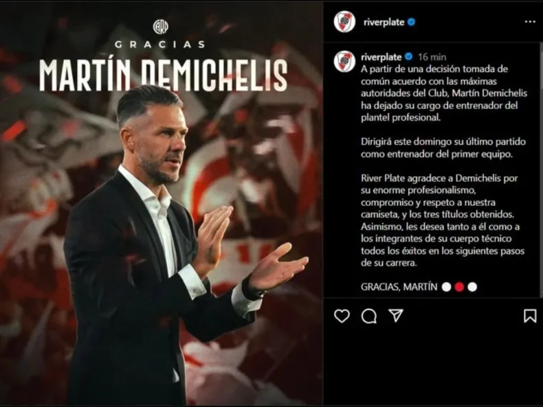 "A partir de una decisión tomada de común acuerdo con las máximas autoridades del Club, Martín Demichelis ha dejado su cargo de entrenador del plantel profesional. Dirigirá este domingo su último partido como entrenador del primer equipo", indicó River en sus cuentas de redes sociales.