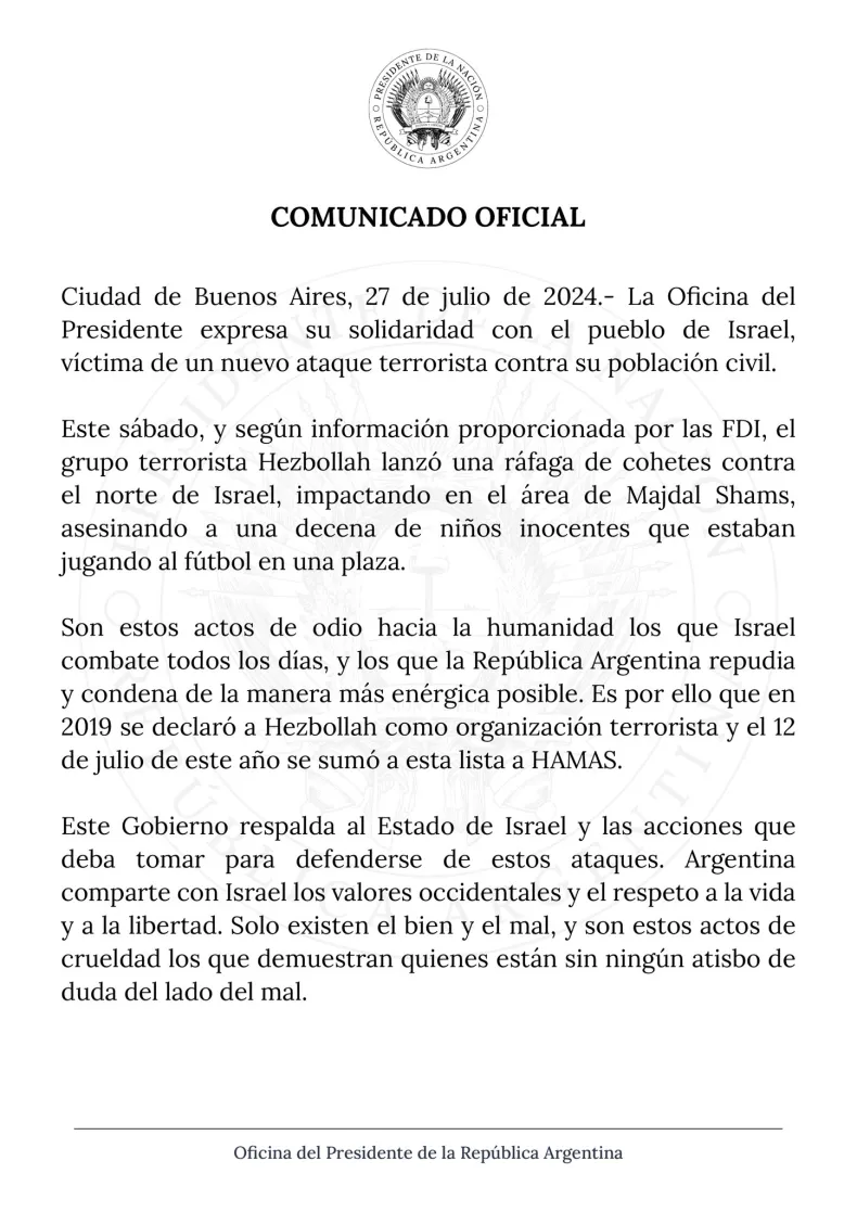 Por último, cierra el escrito: "Argentina comparte con Israel los valores occidentales y el respeto a la vida y a la libertad. Solo existen el bien y el mal, y son estos actos de crueldad los que demuestran quienes están sin ningún atisbo de duda del lado del mal".