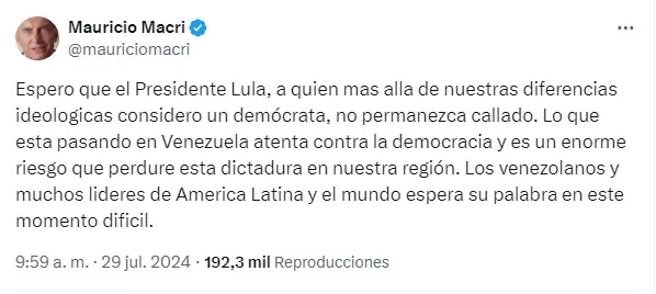 El expresidente nacional, Mauricio Macri, le pidió al presidente de Brasil, Lula Da Silva, que se pronuncie en relación al resultado de los comicios en Venezuela, en el marco de los distintos reclamos de la oposición sobre irregularidades en el proceso electoral.