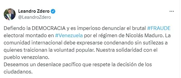 "Defiendo la DEMOCRACIA y es imperioso denunciar el brutal fraude electoral montado en Venezuela por el régimen de Nicolás Maduro. La comunidad internacional debe expresarse condenando sin sutilezas a quienes traicionan la voluntad popular. Nuestra solidaridad con el pueblo venezolano", publicó Zdero en X y agregó: "Deseamos un desenlace pacífico que respete la decisión de los ciudadanos".