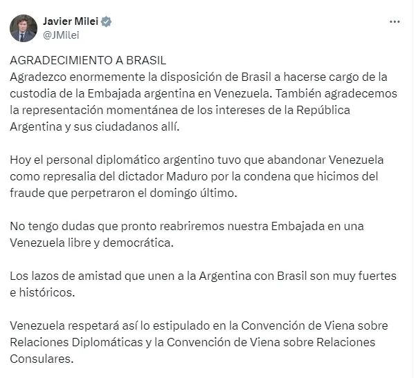 "Hoy el personal diplomático argentino tuvo que abandonar Venezuela como represalia del dictador Maduro por la condena que hicimos del fraude que perpetraron el domingo último. No tengo dudas que pronto reabriremos nuestra Embajada en una Venezuela libre y democrática. Los lazos de amistad que unen a la Argentina con Brasil son muy fuertes e históricos. Venezuela respetará así lo estipulado en la Convención de Viena sobre Relaciones Diplomáticas y la Convención de Viena sobre Relaciones Consulares", completó el presidente.