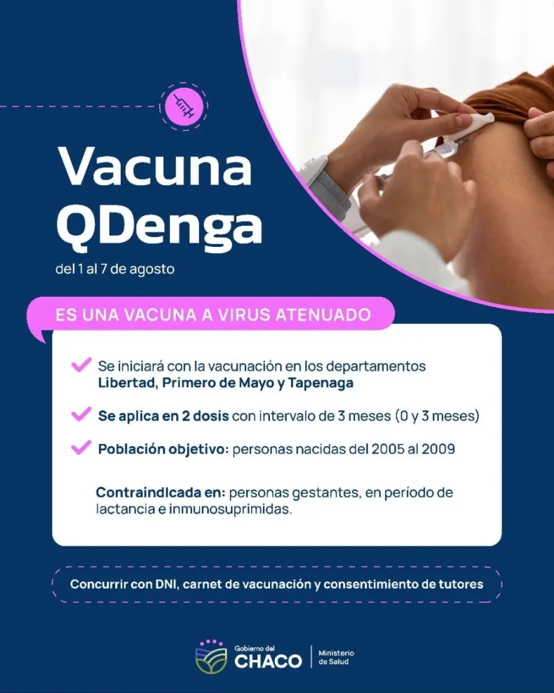La vacunación se iniciará de forma simultánea en los departamentos de Libertad, Primero de Mayo y Tapenagá, en concordancia con el Plan Provincial de Vacunación. La vacuna QDenga, a base de virus atenuado, será administrada en dos dosis, la primera desde hoy hasta el 7 de agosto y la segunda a los tres meses.