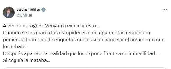Ante esta situación, la representante de Italia decidió no estrechar la mano con Imane, y la polémica se hizo presente en el lugar. "A ver boluprogres. Vengan a explicar esto...Cuando se les marca las estupideces con argumentos responden poniendo todo tipo de etiquetas que buscan cancelar el argumento que los rebate.Después aparece la realidad que los expone frente a su imbecilidad...Si seguía la mataba...", manifestó Milei.
