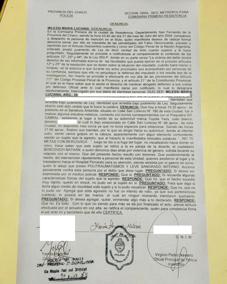 La influencer de Resistencia, Luciana Milessi, realizó una denuncia en la Comisaría Primera a las 23:45 de este miércoles, tras sufrir una agresión al salir del Sanatorio Palacios. Según relató, alrededor de las 21 horas, se dirigía hacia su automóvil cuando un individuo la atacó, propinándole varios golpes en la cabeza con un objeto contundente. Durante el ataque, el agresor le dijo: "No te metas con Bercovich", antes de darse a la fuga.