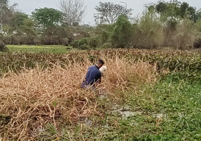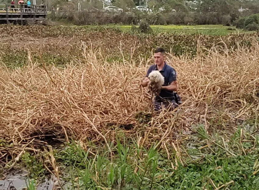 Inmediatamente, se dirigieron al lugar para corroborar y observaron al perro atrapado entre los camalotes. Acto seguido, ingresaron a la laguna y rescataron al animal sano y salvo.