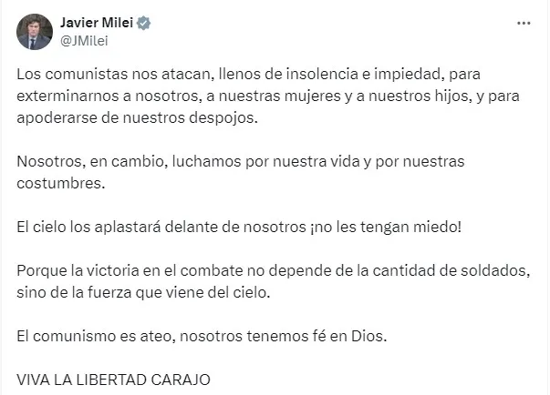 Para el Presidente, "el comunismo es ateo" mientras que los libertarios tienen "fe en Dios". "Viva la libertad carajo", concluyó el mensaje.