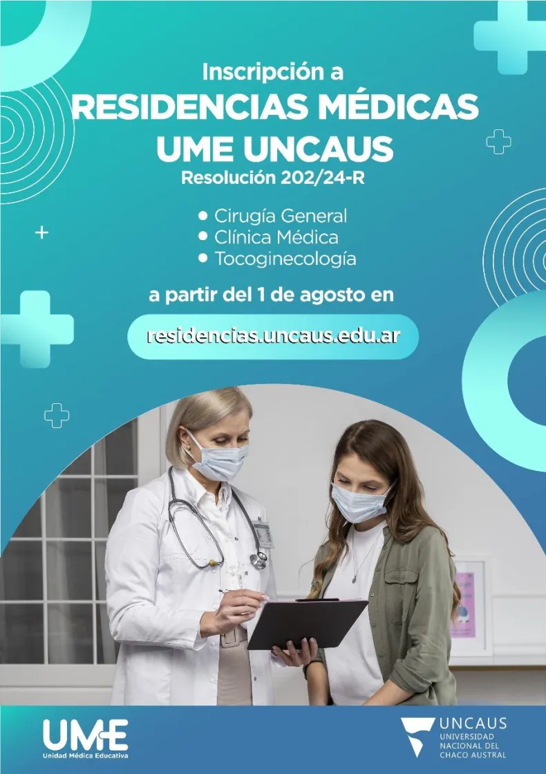 La Unidad Médica Educativa de la Universidad Nacional del Chaco Austral (U.M.E. UNCAUS), informa que desde el 1 al 23 de agosto del corriente año inclusive, se encuentran abiertas las inscripciones a residencias médicas en su institución, para el periodo 2024-2027.