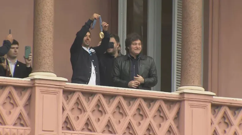 Javier Milei recibió a "Maligno" Torres y mostraron la medalla de oro en el balcón de la Casa Rosada