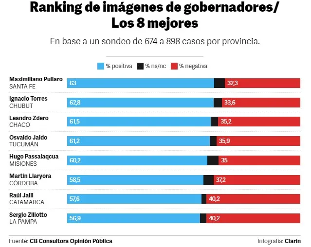 La encuesta, realizada en agosto por la consultora CB de Opinión Pública, revela que el podio de los representantes con mayor valoración positiva está encabezado por el mandatario santafesino Maximiliano Pullaro, seguido por Ignacio Torres de Chubut y Leandro Zdero.