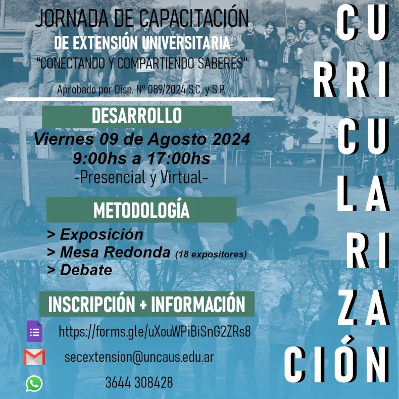 La Universidad Nacional del Chaco Austral (UNCAUS), a través de la Secretaría de Cooperación y Servicios Públicos, invita a una Jornada de Capacitación sobre Curricularización de la Extensión Universitaria titulada "Conectando y Compartiendo Saberes", que se realizará el viernes 09 de agosto. La misma se realizará de 9 horas a 17 horas, de manera presencial y virtual, aprobada por Disposición N° 089/2024 – S.C. y S.P.