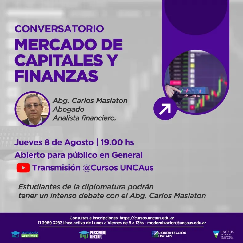 En el marco de la Diplomatura en Mercado de Capitales y Finanzas de la Universidad Nacional del Chaco Austral (UNCAUS), que comenzó el pasado 31 de mayo con modalidad virtual, se realizará un conversatorio gratuito sobre la temática, a cargo del abogado y analista financiero, Carlos Maslatón.