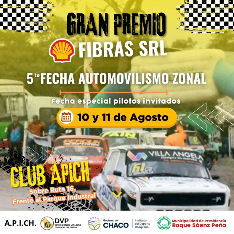 La quinta fecha del Zonal de Automovilismo tendrá lugar este 10 y 11 de agosto en el Circuito de Apich de Sáenz Peña. Se pondrá en juego el Gran Premio "Fibras s.r.l.", con las categorías 1 y 2 del TC chaqueño que irán en busca del galardón.