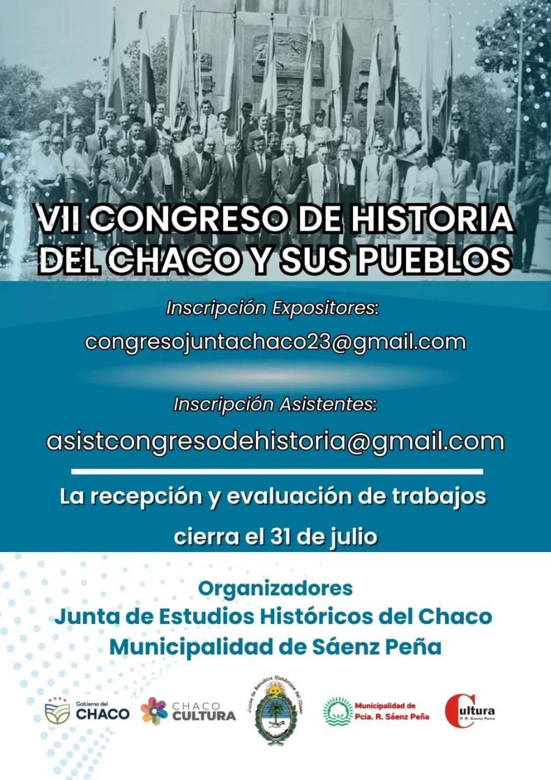 El 7° Congreso de Historia del Chaco y sus Pueblos se desarrollará este 14, 15 y 16 de agosto en el Club Social de Sáenz Peña, donde indicaron que "ya se está trabajando para poder brindar lo mejor en este marco de capacitación". El evento es totalmente gratuito y otorgará puntaje docente.
