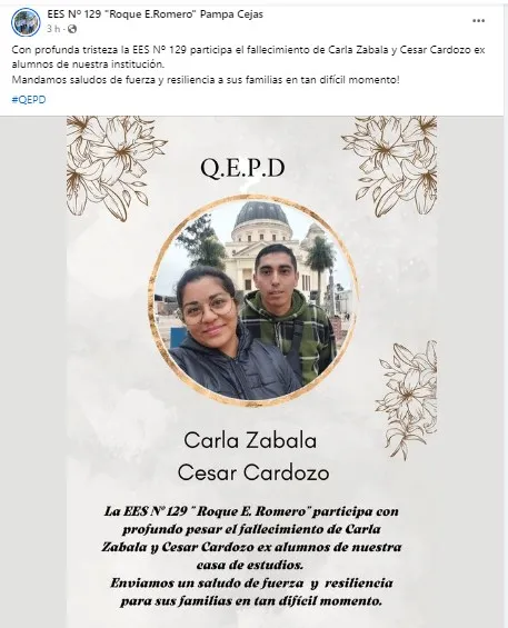 Luego, desde el EES N° 129 realizaron un posteo en sus redes sociales: "el fallecimiento de Carla Zabala y Cesar Cardozo ex alumnos de nuestra institución. Mandamos saludos de fuerza y resiliencia a sus familias en tan difícil momento #QEPD".
