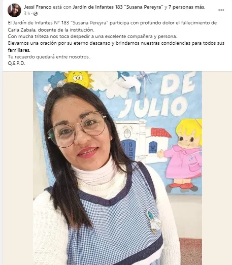 "El Jardín de Infantes N° 183 "Susana Pereyra" participa con profundo dolor el fallecimiento de Carla Zabala, docente de la institución. Con mucha tristeza nos toca despedir a una excelente compañera y persona. Elevamos una oración por su eterno descanso y brindamos nuestras condolencias para todos sus familiares. Tu recuerdo quedará entre nosotros. Q.E.P.D.", expusieron desde el jardín donde trabajaba.