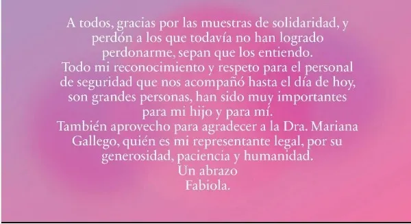 "También aprovecho para agradecer a la Dra. Mariana Gallego, quien es mi representante legal, por su generosidad, paciencia y humanidad", cerró el posteo.