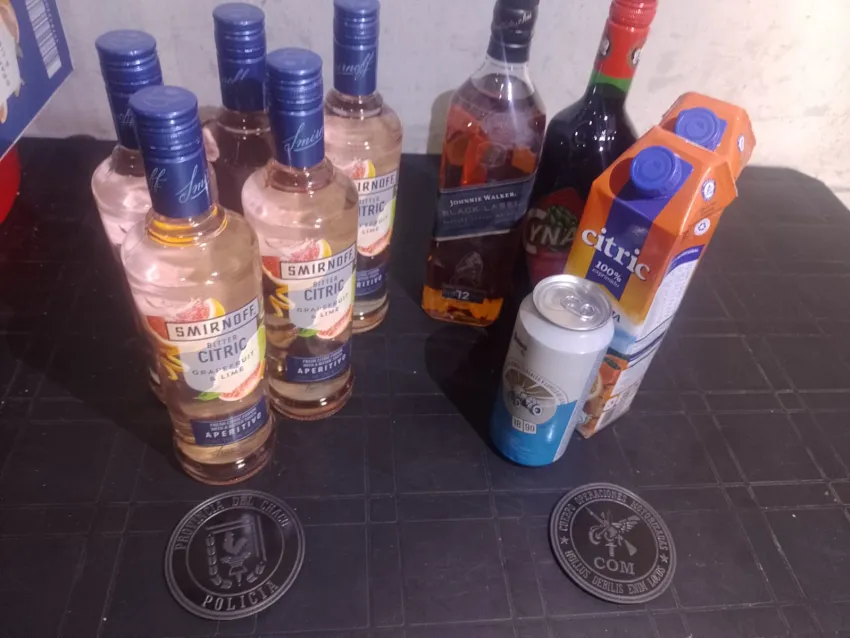 Los delincuentes fueron descubiertos por los agentes. En total, secuestraron cinco botellas de Smirnoff Citric, una botella de Cynar, una lata de cerveza Quilmes, una botella de whisky Johnnie Walker Black Label y dos jugos de manzana de litro.