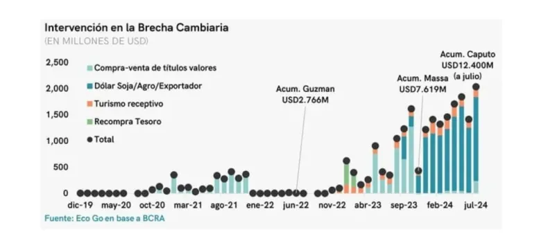 Más allá de la última medida para controlar la brecha, el cálculo general de intervención sobre los dólares financieros, de USD 12.400 millones, estuvo explicada en su mayor parte por el dólar 80/20 exportador. En ese concepto de intervención sobre la brecha, EcoGo también incluye, con cuantías menores, el ingreso de dólares por turismo receptivo, la compraventa de bonos y recompras del Tesoro.