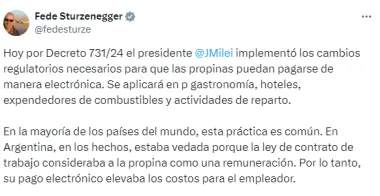 Esta mañana, el funcionario anunció la medida en X donde posteó: "En la mayoría de los países del mundo, esta práctica es común. En Argentina, en los hechos, estaba vedada porque la ley de contrato de trabajo consideraba a la propina como una remuneración. Por lo tanto, su pago electrónico elevaba los costos para el empleador".