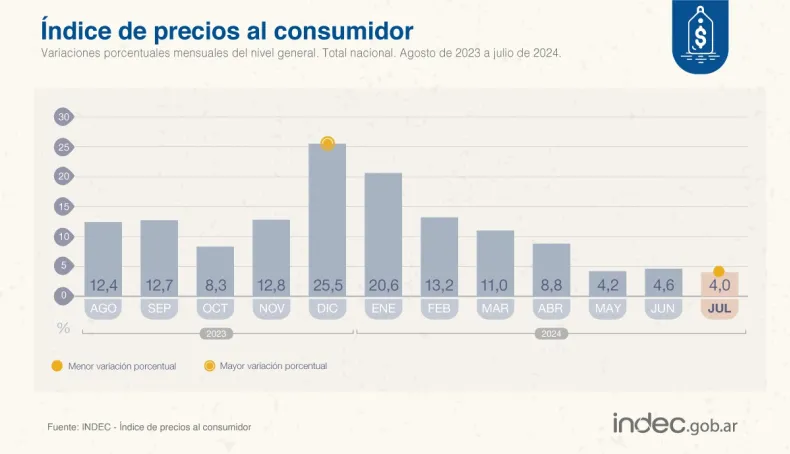 Este miércoles, el Instituto Nacional de Estadísticas y Censos (INDEC) brindó los datos del Índice de Precios al Consumidor y demostró que, en julio de 2024, la inflación fue del 4%, mientras que la interanual llegó al 263,4%.