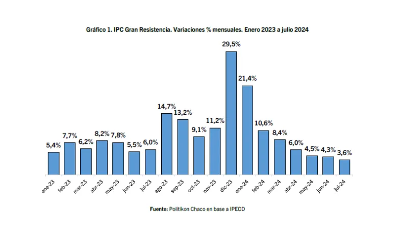 Además, la consultora Politikon Chaco informó que este número representa la suba mensual más baja de los últimos treinta y dos meses , es decir desde 2021 para este aglomerado urbano. Además, se registró una desaceleración de la velocidad de crecimiento del IPC por séptimo mes consecutivo (-0,7 puntos porcentuales respecto al registro de junio).