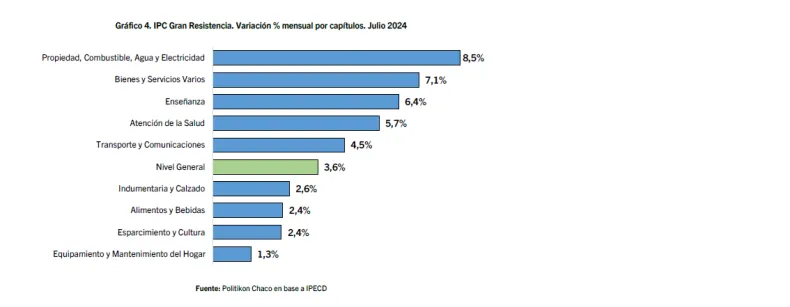 El capítulo que registró el mayor incremento mensual de precios en el Gran Resistencia en julio fue, por tercer mes consecutivo, el de Propiedad, Combustible, Agua y Electricidad que tuvo una suba del 8,5% traccionado principalmente por el alquiler de la vivienda y en menor medida por subas en los servicios públicos; en segundo lugar se ubicó Bienes y Servicios varios con un alza del 7,1% empujados por cigarrillos; y el podio se completa con Enseñanza que se incrementó en 6,4% por fuerza en la suba de servicios educativos.