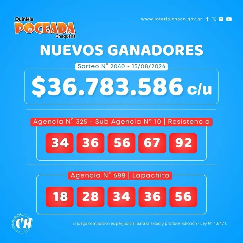 El ganador de Resistencia realizó su jugada en la Agencia N° 325, con los números 34, 36, 56, 67 y 92. En Lapachito la apuesta fue en la Agencia N° 688 con los números 18, 28, 34, 36 y 56.