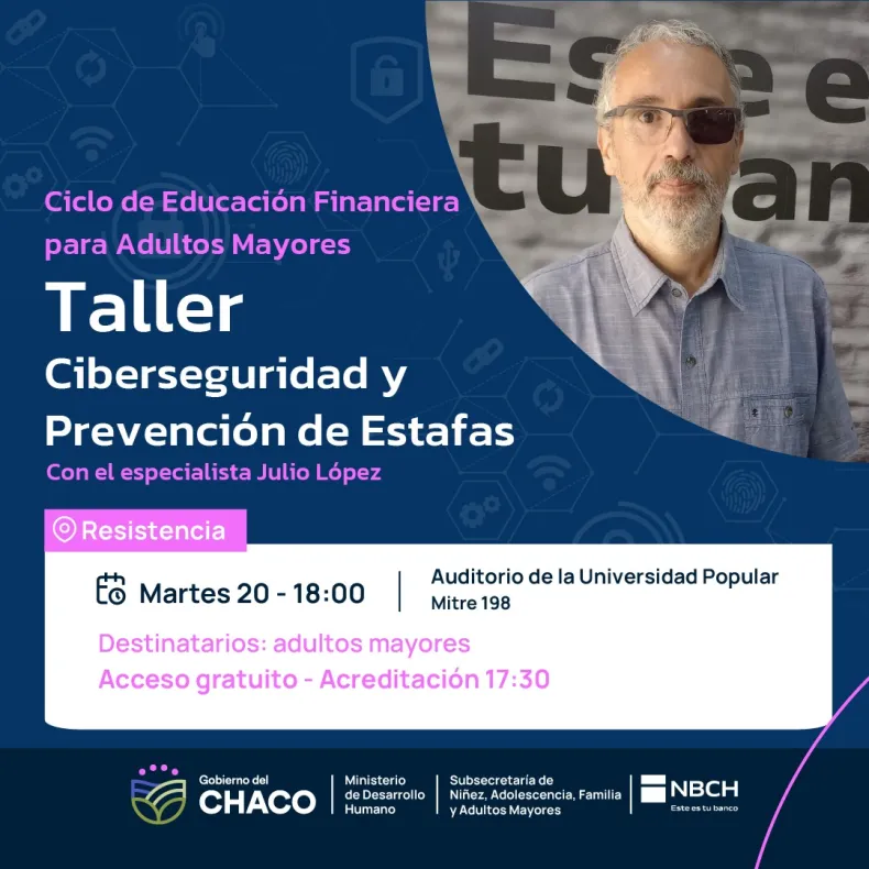 El primer taller de este ciclo será el próximo martes 20, a las 18, en el Auditorio de la Universidad Popular (Mitre 198, Resistencia), donde el reconocido especialista Julio López expondrá recomendaciones, información y herramientas sobre Ciberseguridad y Prevención de Estafas.