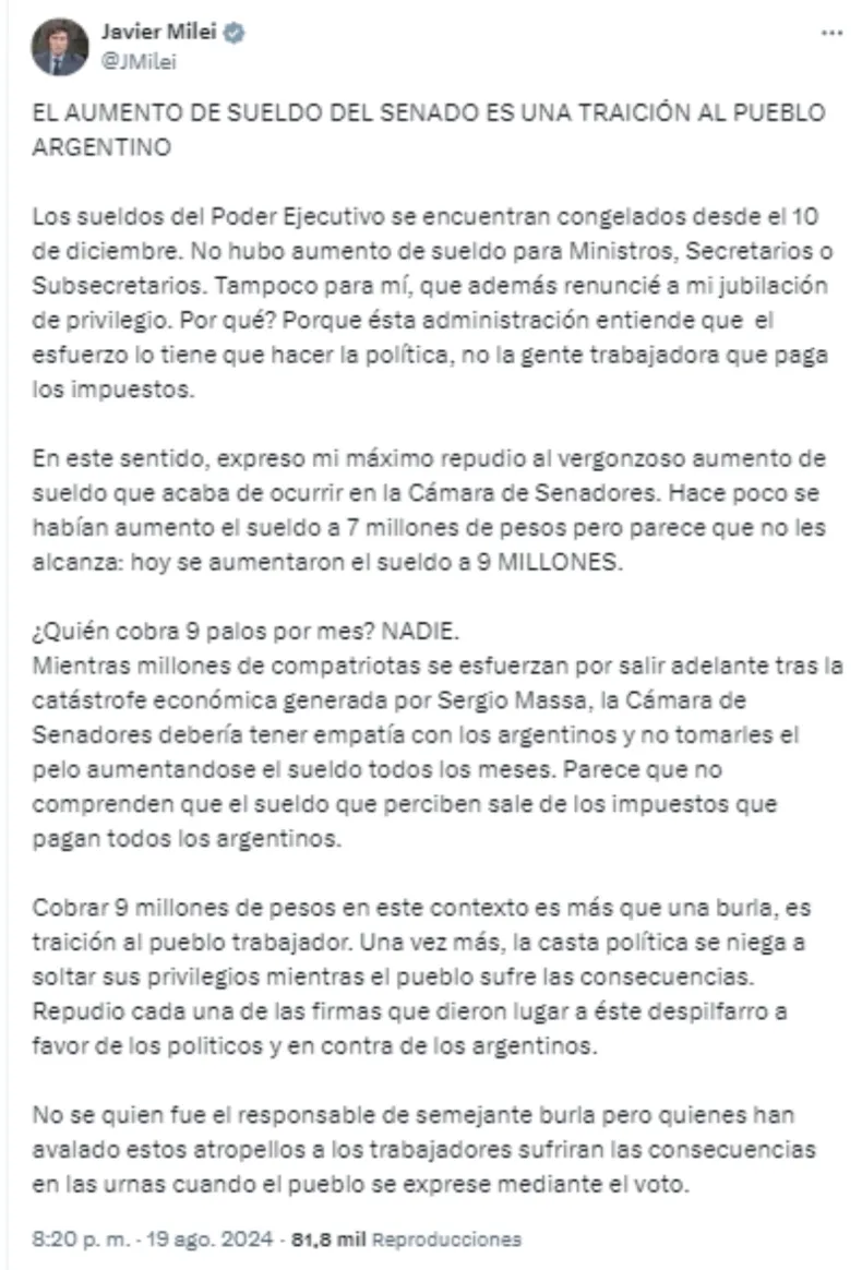 Luego de que el Senado oficializara un aumento de la dieta de los legisladores (que llevará los salarios a $9 millones bruto), Milei se volcó a X para criticar la decisión: "El aumento de sueldo de los senadores es una traición al pueblo". El mensaje del Presidente llega en medio de la tensión con su vice y titular del Senado, Victoria Villarruel.