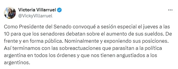 La vicepresidente Victoria Villarruel convocó a una sesión especial para el próximo jueves, en la cual los senadores debatirán sobre el polémico aumento de sus sueldos. A través de un comunicado publicado en las redes sociales, Villarruel instó a que la discusión se realice "de frente y en forma pública", con el fin de terminar con las "sobreactuaciones que parasitan a la política argentina en todos los órdenes".