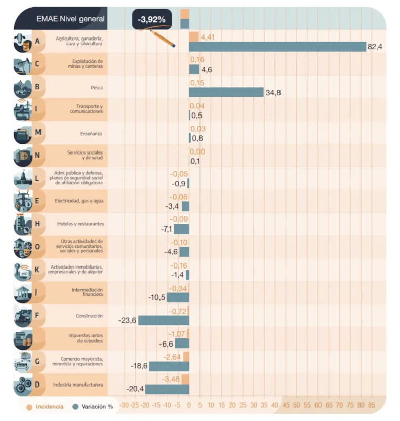 El sector de Agricultura, ganadería, caza y silvicultura fue el de mayor variación interanual positiva del EMAE con el 82,4%, seguido por Pesca, con el 34,8%.