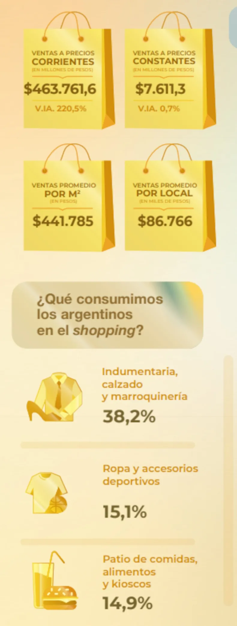 En este sentido, los rubros que lideraron las ventas a precios corrientes de los shoppings fueron: "Indumentaria, calzado y marroquinería" (38,2%); "Ropa y accesorios deportivos" (15,1%); "Patio de comidas, alimentos y kioscos" (14,9%); y "Electrónicos, electrodomésticos y computación" (10,8%).
