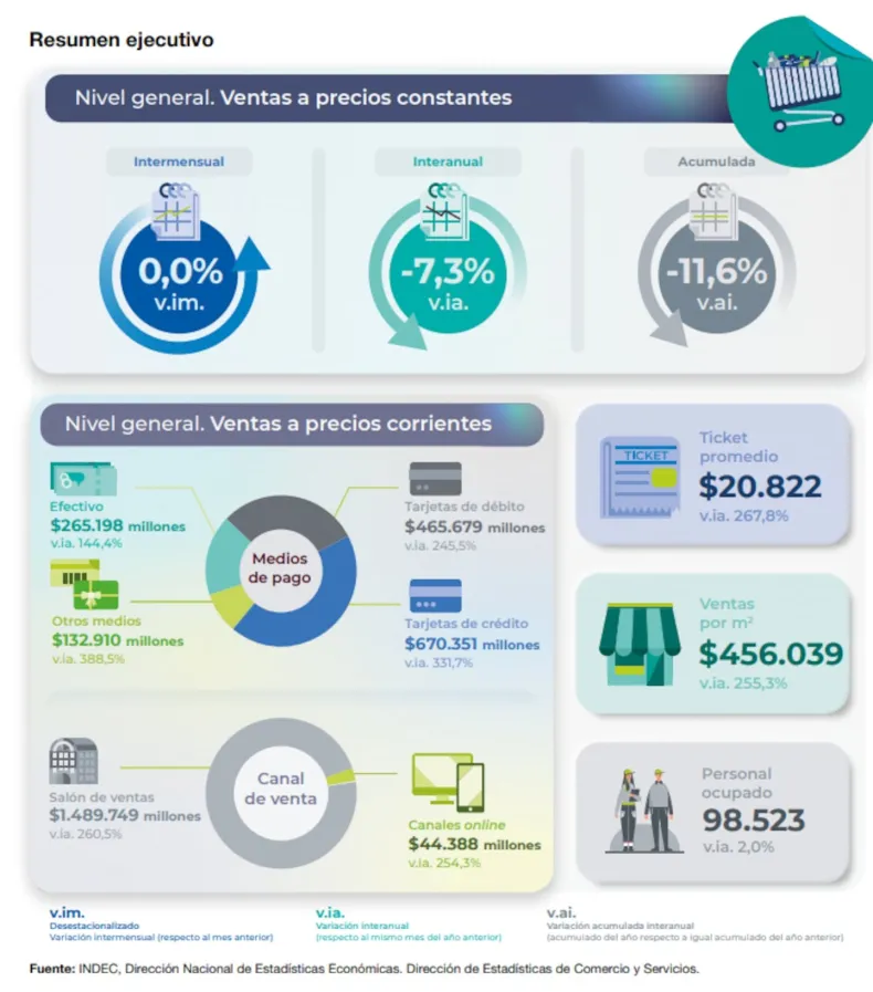 Además, el informe precisó que las ventas a precios corrientes realizadas con medios de pago como billeteras virtuales ascendieron a 132.910.224 miles de pesos, lo que representa el 8,7% del total y muestra un aumento del 388,5%.
