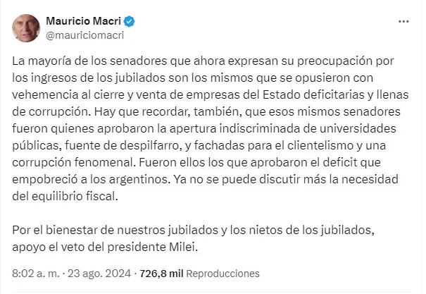 En la misma sintonía del actual mandatario, el titular del PRO, Mauricio Macri publicó en X: "La mayoría de los que ahora expresan su preocupación por los ingresos de los jubilados son los mismos que se opusieron con vehemencia al cierre y venta de empresas del Estado deficitarias y llenas de corrupción".