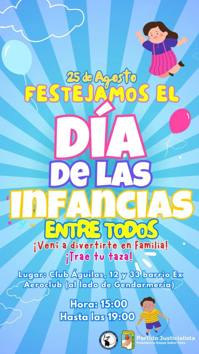 Este domingo 25 de agosto, los niños de Sáenz Peña podrán disfrutar de una gran fiesta en honor al Día de las Infancias en el Club Águilas, ubicado en 12 y 13, en el barrio Ex Aeroclub, al lado de Gendarmería, desde las 15:00 hasta las 19:00 horas.