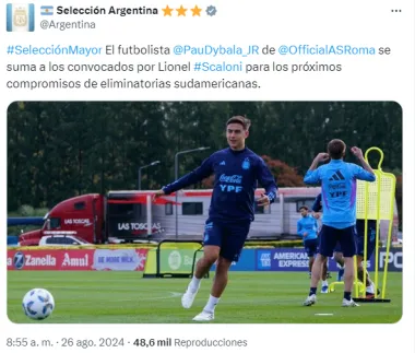 Paulo Dybala forma parte de la lista de convocados por Lionel Scaloni para los próximos partidos de la Selección argentina ante Chile, el jueves 5 de septiembre, a las 21, en el Monumental, y el martes 10, contra Colombia, a las 17.30, en Barranquilla por las Eliminatorias Sudamericanas rumbo al Mundial 2026.