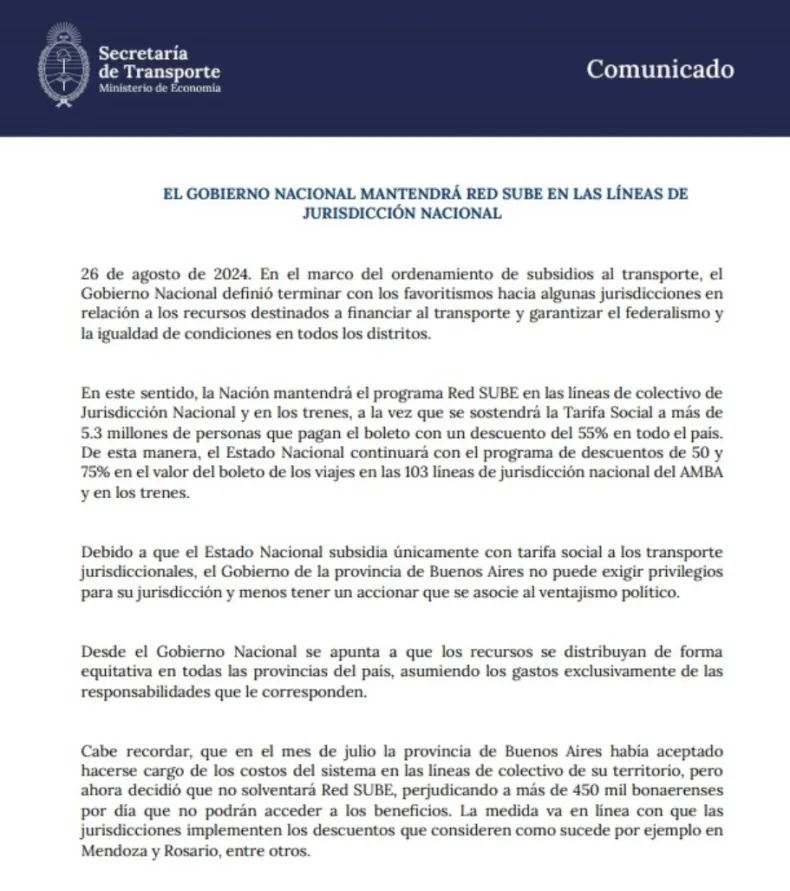 El Gobierno anunció que mantendrá la Red SUBE en las líneas de jurisdicción nacional. "Se definió terminar con los favoritismos hacia algunas jurisdicciones en relación a los recursos destinados a financiar el transporte y garantizar el federalismo", expresaron mediante un comunicado emitido por la Secretaría de Transporte.