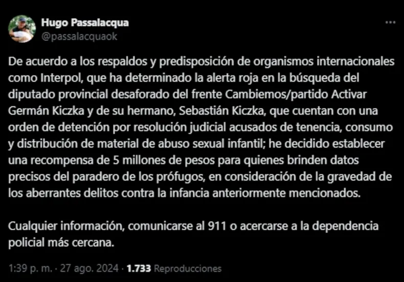 "De acuerdo a los respaldos y predisposición de organismos internacionales como Interpol, que ha determinado la alerta roja en la búsqueda del diputado provincial desaforado del frente Cambiemos/partido Activar Germán Kiczka y de su hermano, Sebastián Kiczka, que cuentan con una orden de detención por resolución judicial acusados de tenencia, consumo y distribución de material de abuso sexual infantil, he decidido establecer una recompensa de 5 millones de pesos para quienes brinden datos precisos del paradero de los prófugos, en consideración de la gravedad de los aberrantes delitos contra la infancia anteriormente mencionados", escribió el mandatario misionero.